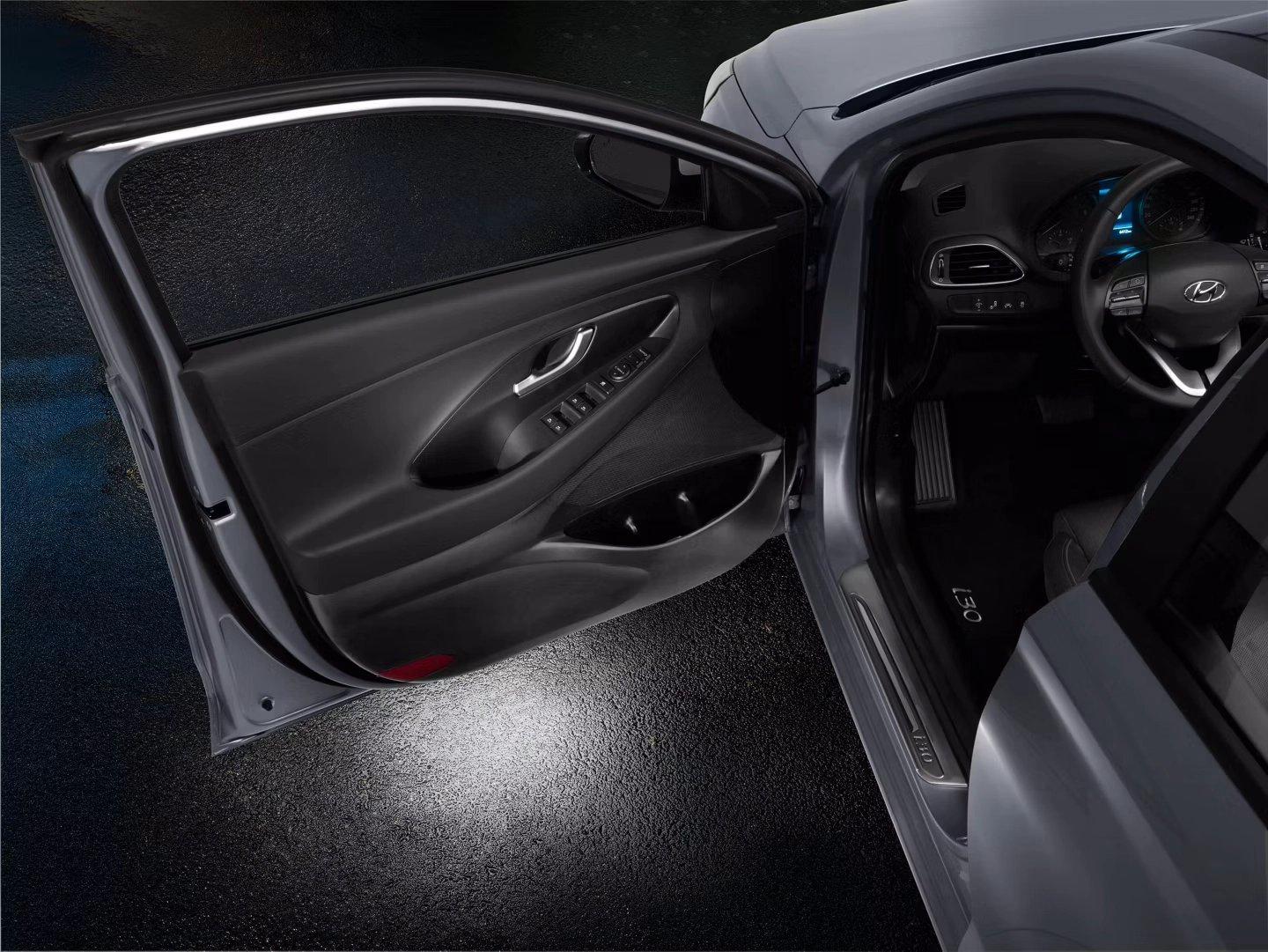 Unesite više profinjenosti u tamu isticanjem logotipa Hyundai na tlu pored otvorenih prednjih vrata. Projektirano s jasnim fokusom i izrazitom sjajem – za profinjeni dodir svakom ulazu.